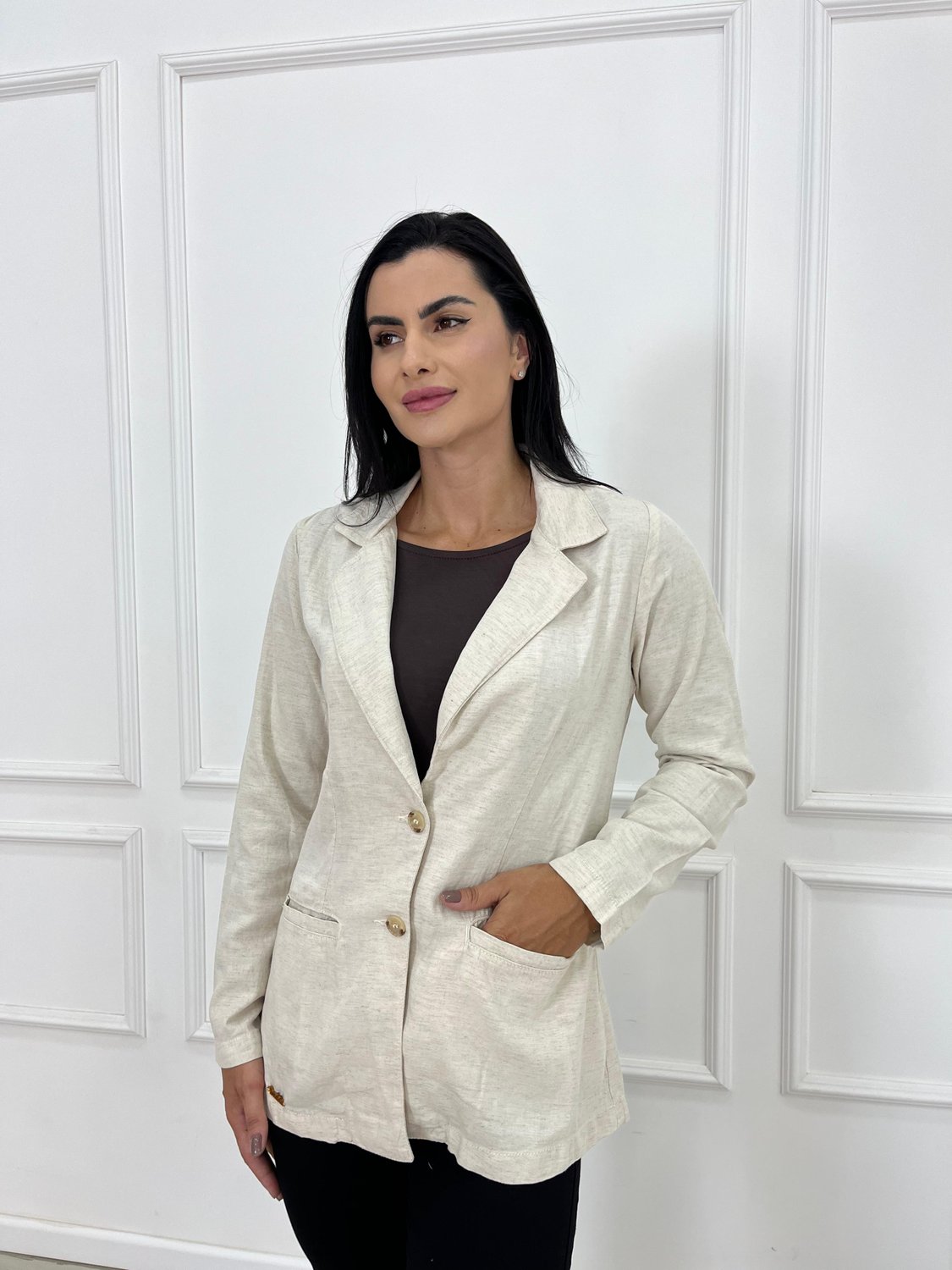O blazer de linho é a peça ideal para quem busca elegância com leveza e conforto. Sofisticado e atemporal, ele traz um visual refinado sem perder a naturalidade, sendo perfeito para compor looks modernos tanto para o dia quanto para a noite.
