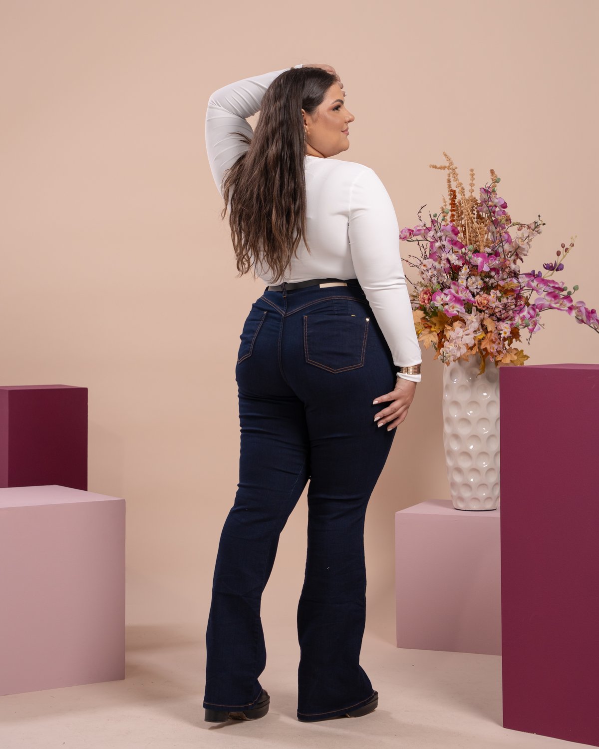 Seu corte sutilmente evasê cria um efeito visual que alonga a silhueta e proporciona mais equilíbrio às proporções do corpo, sendo especialmente indicada para quem busca um caimento que valorize as curvas sem marcar excessivamente. É uma excelente alternativa para quem quer fugir tanto da calça totalmente justa quanto dos modelos mais largos.