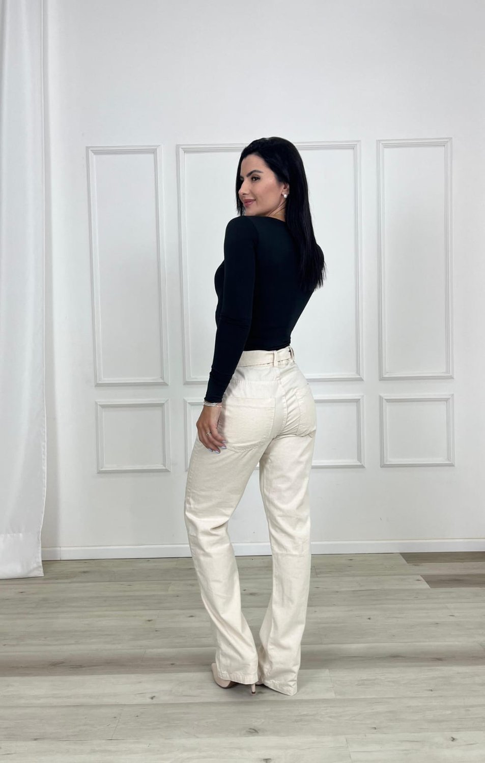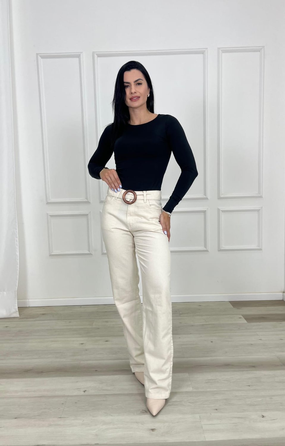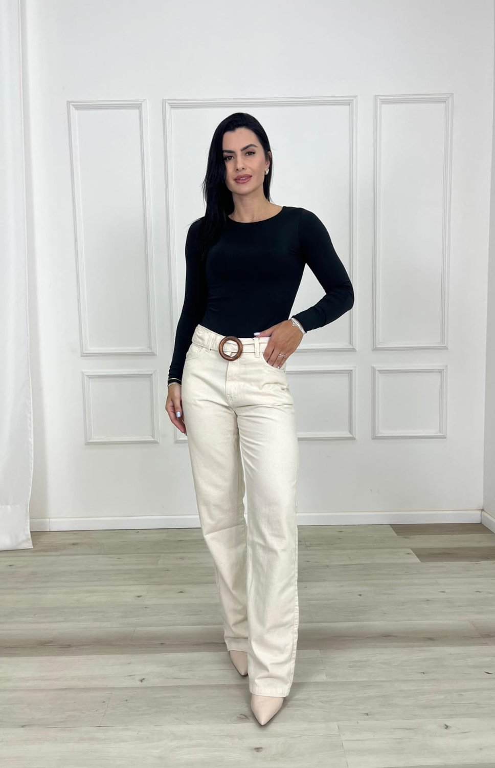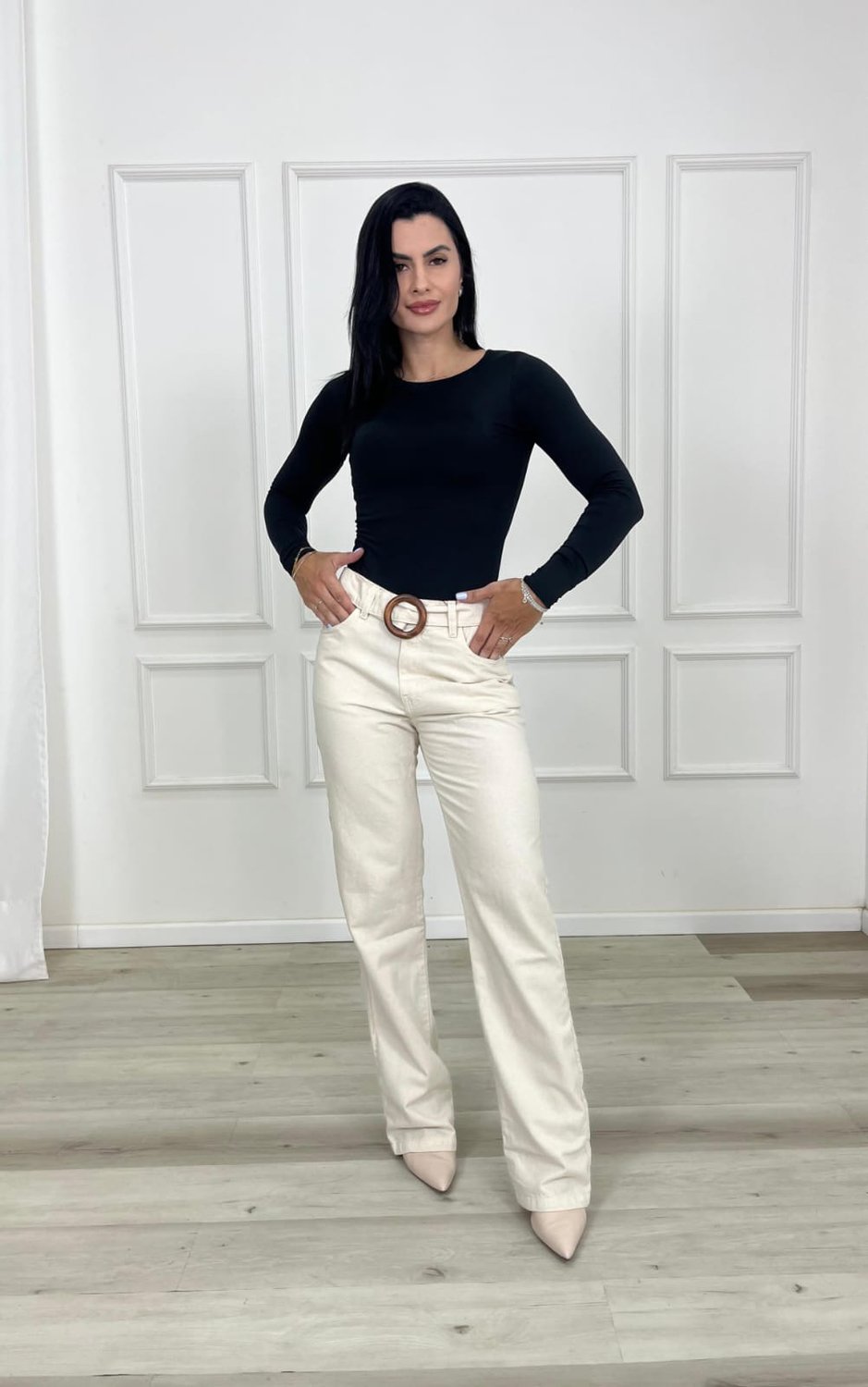A calça de perna reta é uma peça clássica e atemporal que se destaca pela sua modelagem equilibrada, elegante e versátil. Seu principal diferencial está no corte uniforme desde o quadril até a barra, sem afunilar ou alargar, proporcionando um caimento reto que valoriza diferentes tipos de corpo. Esse design cria uma silhueta alongada e sofisticada, sendo ideal tanto para composições casuais quanto para produções mais formais.