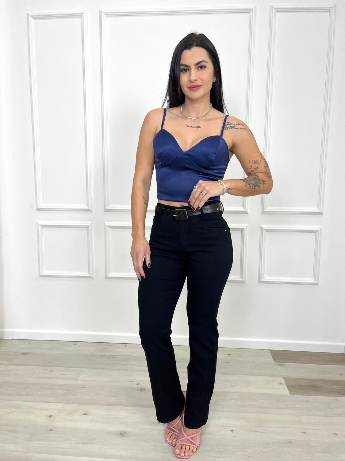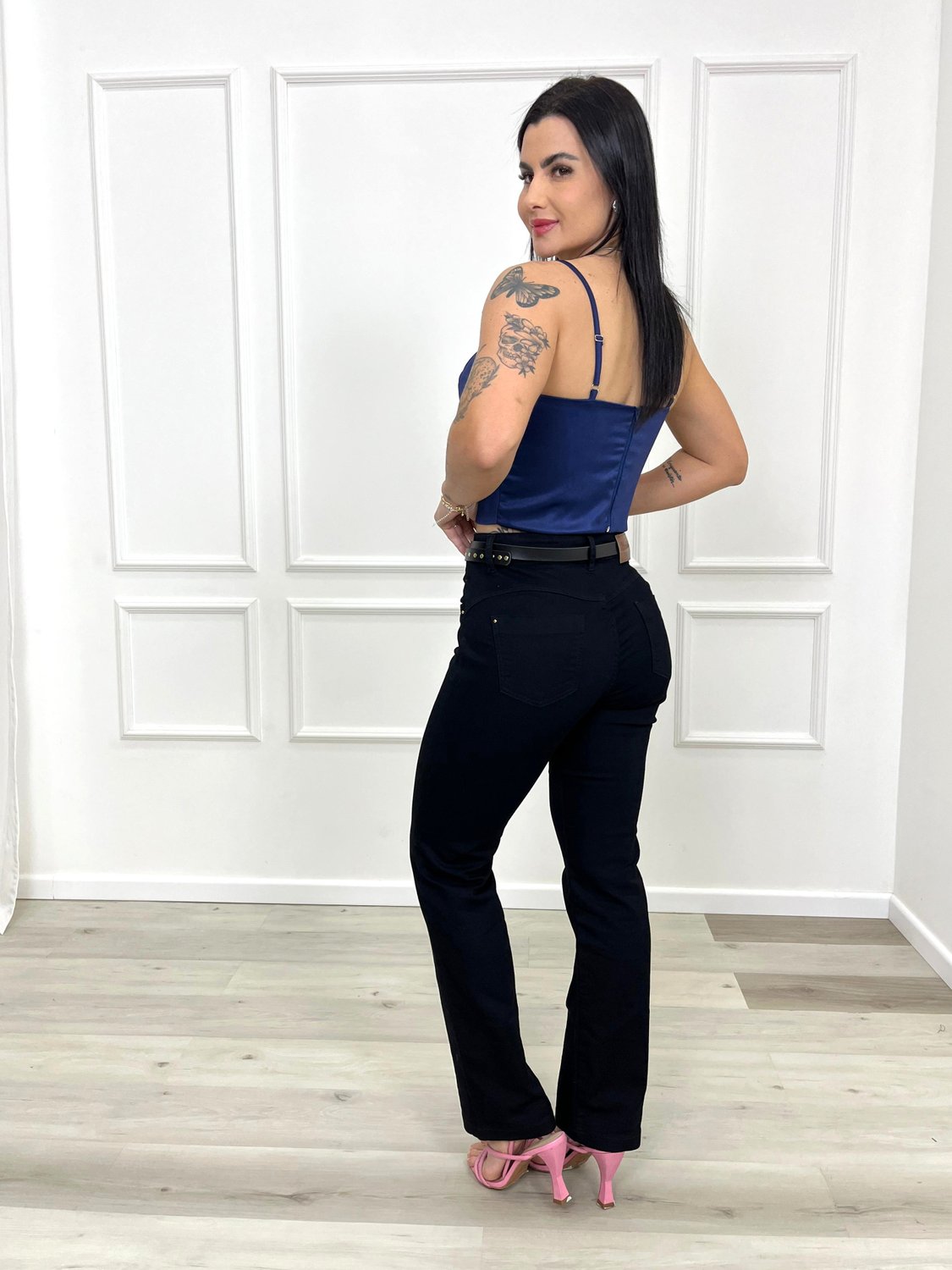 Calça Perna Reta Jeans Color Preto Com Cinto