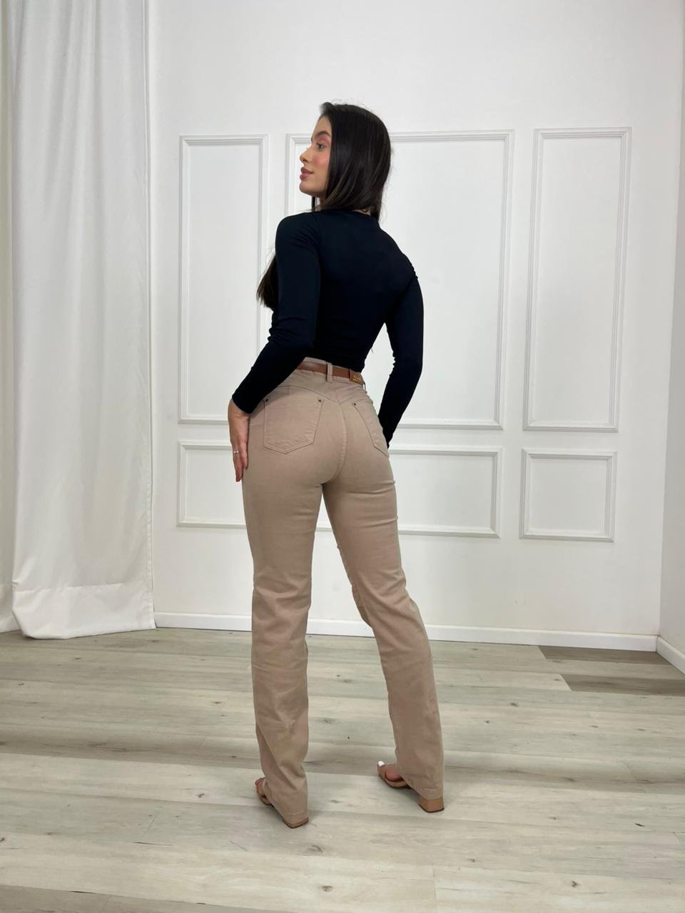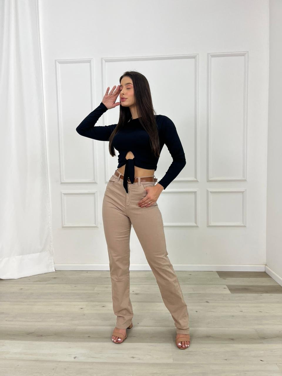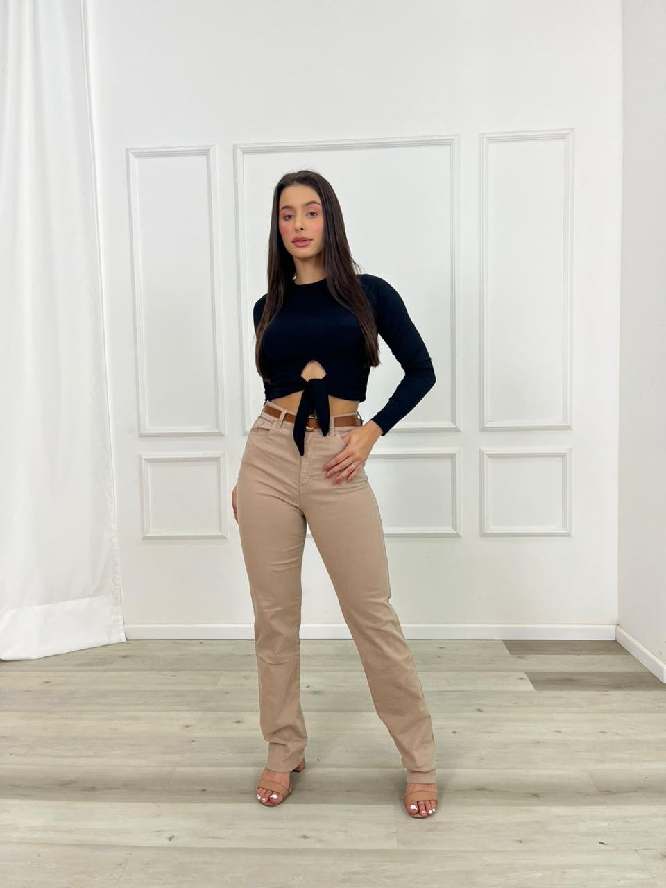 Sua principal característica é a modelagem reta desde o quadril até a barra, criando uma linha uniforme nas pernas. Esse tipo de corte proporciona um caimento mais solto do que a calça skinny, mas ainda mantém um visual alinhado e sofisticado. Por isso, é uma ótima opção para quem busca conforto sem abrir mão do estilo.