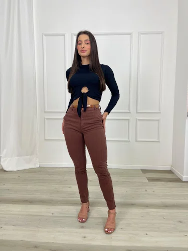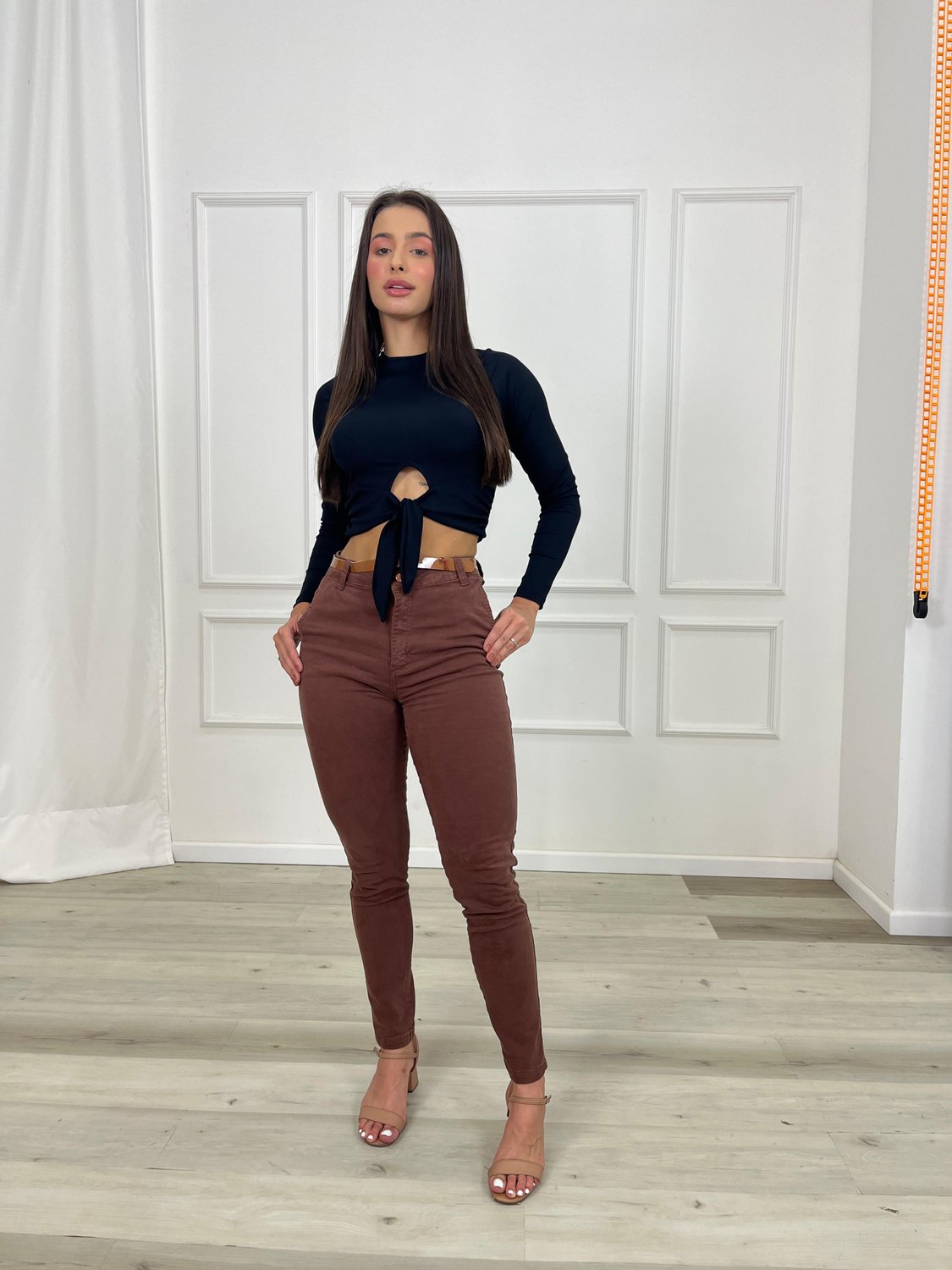 Com modelagem ajustada ao corpo, a calça skinny possui um design que acompanha as curvas desde a cintura até a barra, proporcionando um visual elegante e contemporâneo. Seu corte justo valoriza a silhueta feminina, criando um efeito alongado nas pernas e garantindo um caimento impecável.