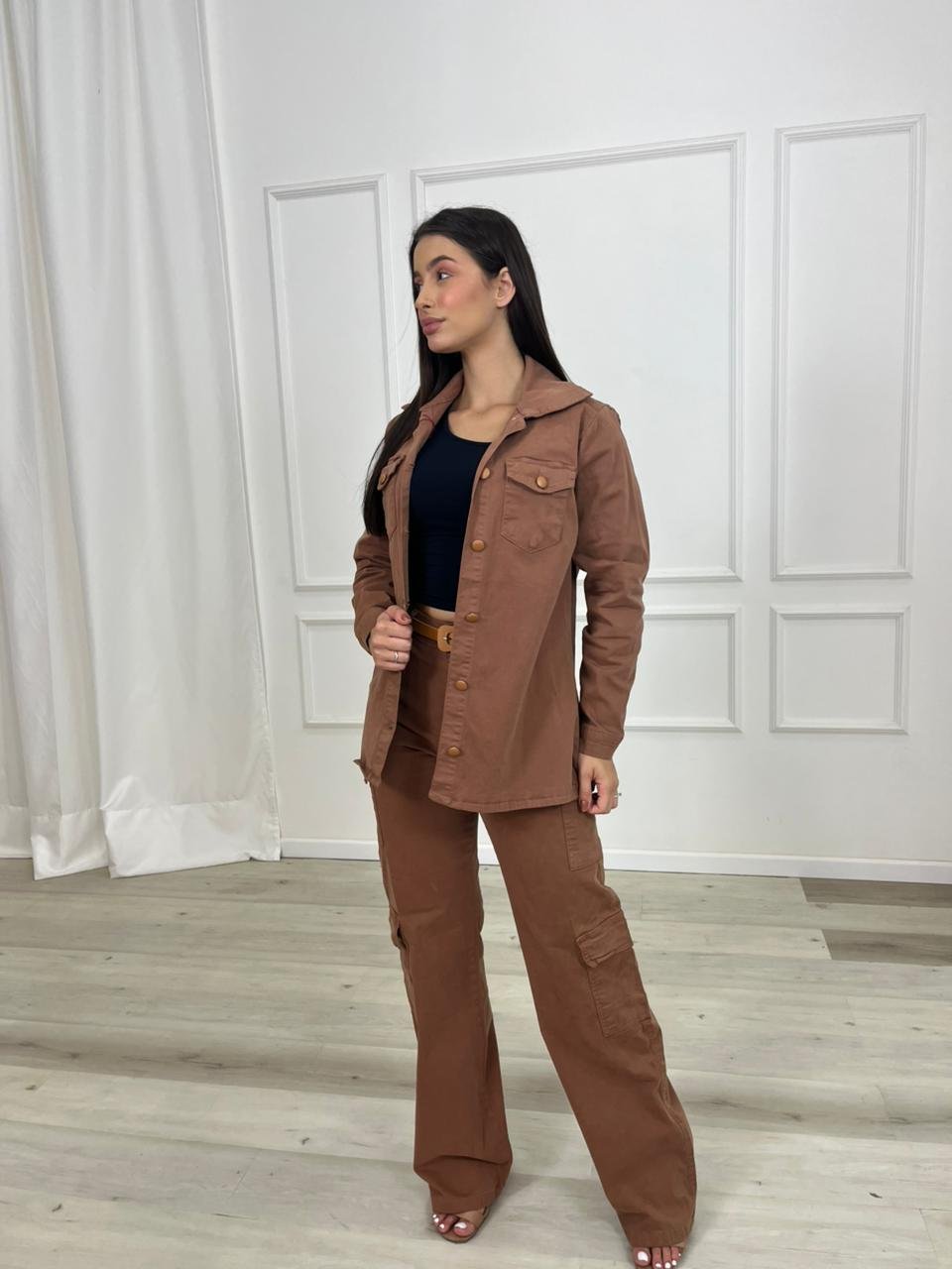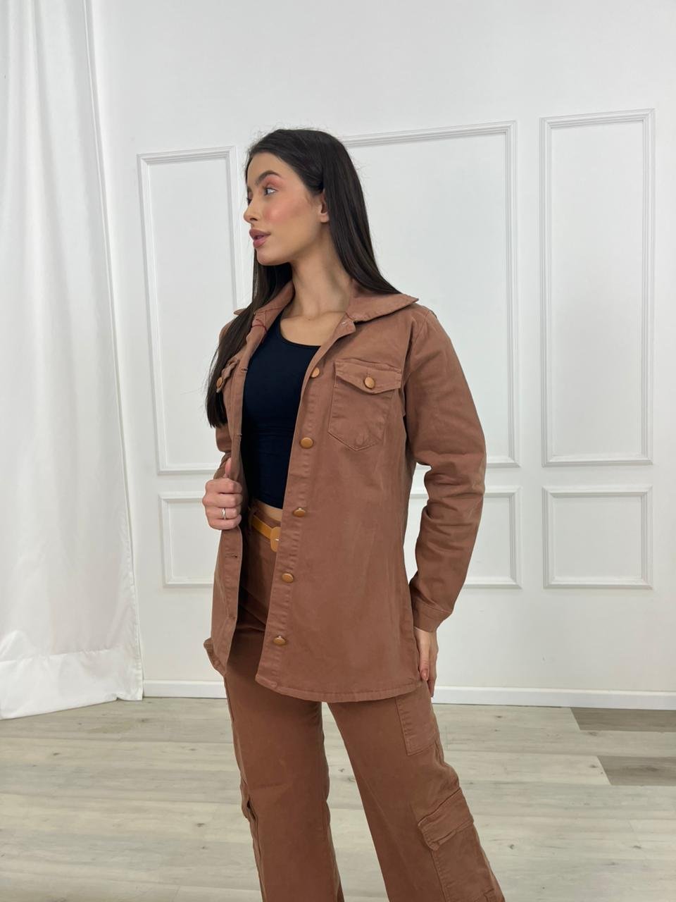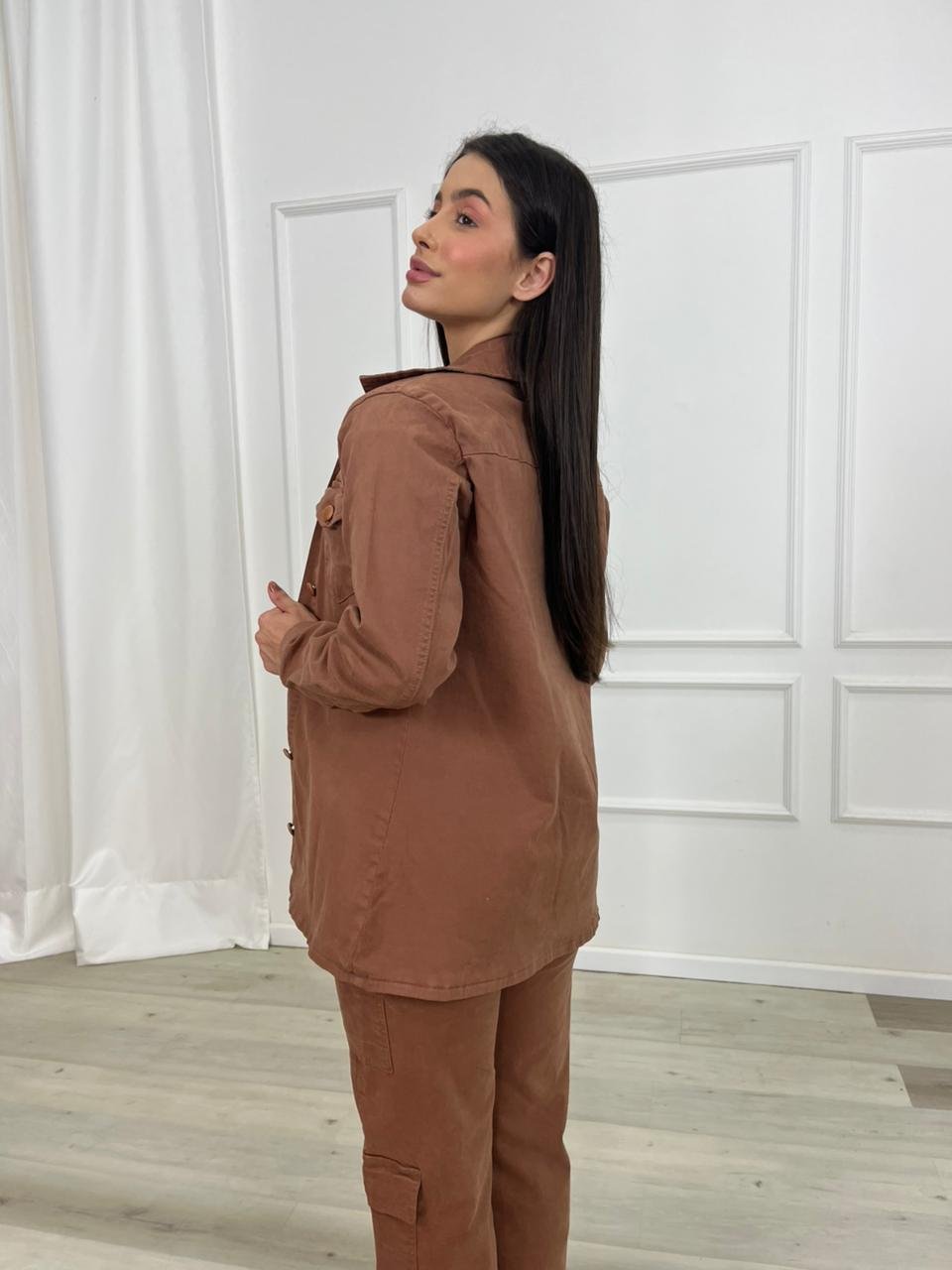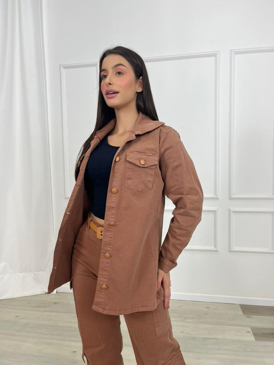 A modelagem pode variar entre ajustada, reta ou mais soltinha, permitindo diferentes estilos de uso. A camisa pode ser usada fechada, como peça principal do look, ou aberta sobre camisetas e blusas, funcionando como uma sobreposição estilosa e moderna.